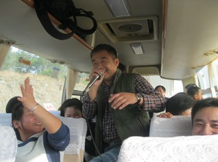 7:57,我們的旅行正式啟航了。一路之上,大家歡歌笑語,情誼融融。娛樂之中,更是形式百出,其中《斗牛》的呼喊聲更是讓人激情四溢。車內(nèi)車外,風彩各現(xiàn),胡董在此情此景的觸動下,興然謂詩一首: