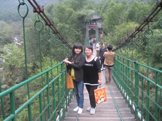 在行進的路上,我們共同看到了六龜拜月的祈福景象,在烏龜賽跑精神的世界里,似乎預(yù)寓著我們勝利的凱旋。風景秀美的明月山,在我們一步一步的接觸下,更佳體現(xiàn)出了她宏偉的身軀。這不是晃月橋嗎?只聽見有人驚呼。在平坦的兩山間,居然有這么一座跨度如此大的索鏈橋,真可謂是,友情相約一線牽,好似牛郎與織女的紅線。