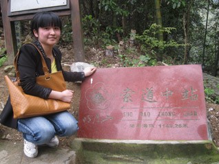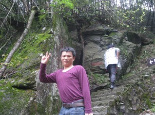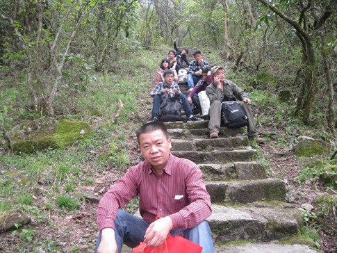 往上走的小徑越來越陡峭,在下山的人口中得知,索道中站就在前方不遠的地方,心中暗喜:實在走不動,就坐纜車上去。15分鐘,我們順利的達到了索道中站,大家爭相拍照留念。現(xiàn)在想想,唯獨,一心只想著休息的我,沒有在此處拍一張照片做紀念。現(xiàn)在看著他們婀娜、多姿的pose,讓人羨慕。旁邊的袁工在我前方喊著:“戴工,前面是一片平地,你手上的小竹桿可以扔掉了。”其實,我早就想扔了,借袁工的話,我順勢放棄了與小竹桿握手的機會。休息的時候,我也在想,這么累,胡董肯定會說我們坐纜車上去的。然而,事非這般。胡董休息了一會兒喊著:“前面不遠的地方,就是山頂了,我們繼續(xù)徒步前進,如果累了,我們每算200步就休息一下,先小目標,再大目標。”