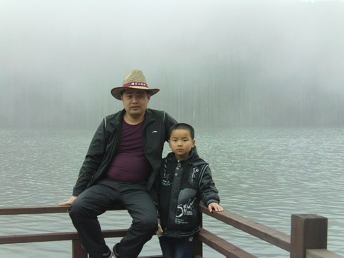 終于,在3個半小時汗水與霧水洗禮的漫長期待里,我們踏上了明月山的山頂。可能,大家都會一直在問,我們的先鋒官呢?在照片的影集里一直沒有看到他的身影,確切的說,應(yīng)該是他們的。這是后來我才知道的。我本以為我們的先鋒官--蔡文斌是一個人爬上山的,哪知,他還帶上了他沒坐纜車的兒子,在我們往山頂攀爬的時候,他們早已在山頂?shù)群蛭覀兌鄷r了。