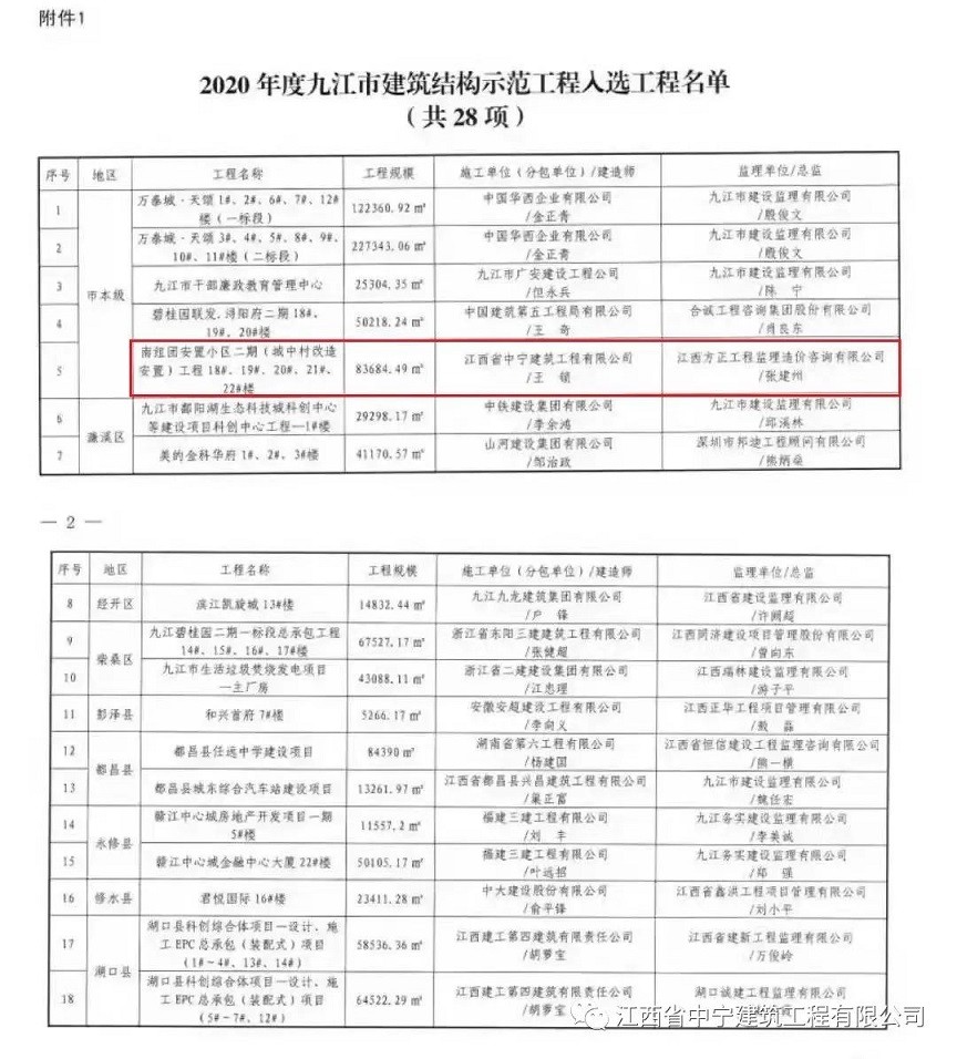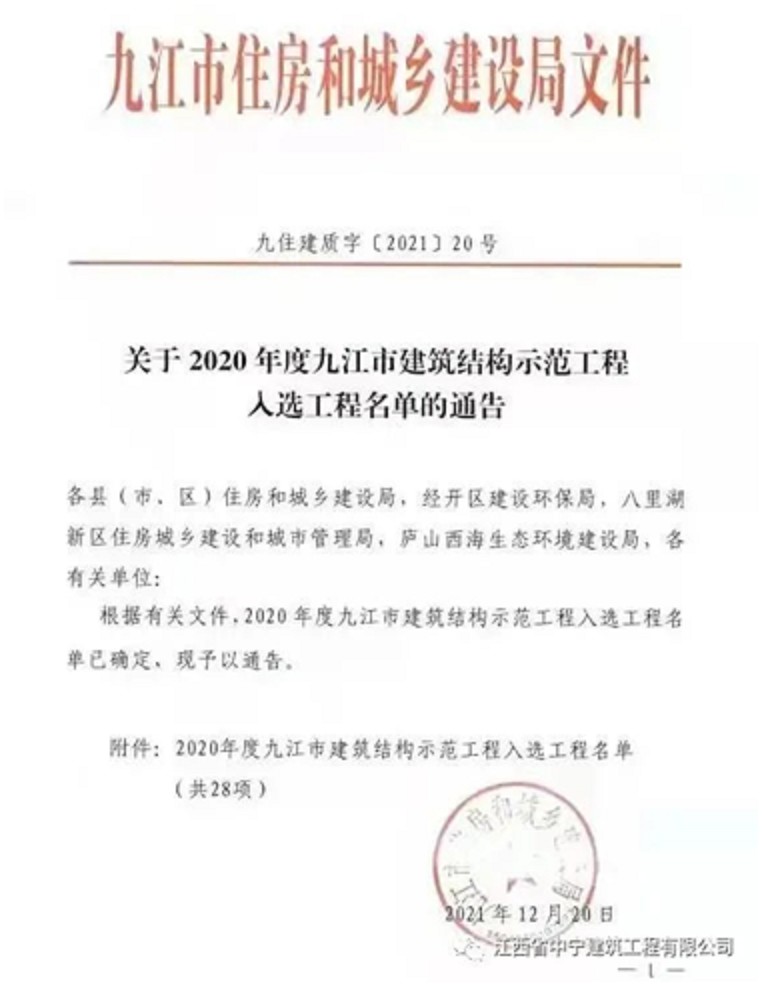 近日,由江西省中寧建工程有限公司承建的南組團安置小區(qū)二期(城中村改造安置)工程18#、19#、20#、21#、22#樓,榮獲2020年度九江市建筑結構示范獎。