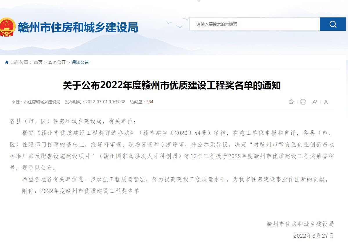 近日,贛州市住房和城鄉建設局發布了《關于公布2022年度贛州市優質建設工程獎名單的通知》,江西省中寧建筑工程有限公司承建的全南中學整體遷建項目一期工程獲得佳績。